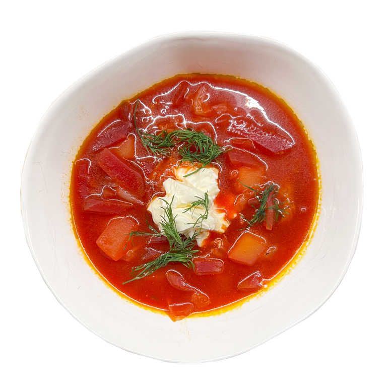 Our borscht is made with Chinese cabbage, potatoes, tomatoes, white giant beans, and beets — for the perfect balance of heartiness and sweetness. Topped with cream cheese and fresh dill, it becomes a comforting, aromatic soup!